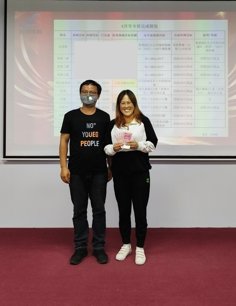 业务部祝艳平家人完成冲刺目标奖励现金700元