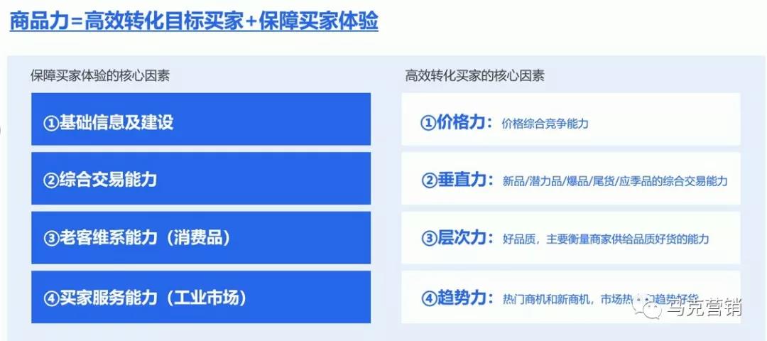 (1)基础信息及建设:例如你的商品是不是五星以上,有没有一定的发货能力。(2)综合交易能力:看的是你这个商品有多少的支付买家数,交易额,支付转化率等指标。(3)老客维系能力:针对消费品的一个老客维系能力,例如商品的老买家访问数,老买家下单数,老买家的下单转化率(4)买家服务能力:针对工业市场的特色服务,例如本地化能力、快速发货能力。(1)价格力:不仅是之前的一个折扣,而是一个跟竞争对手的价格综合竞争能力。(2)垂直力:这个商品它是新品还是潜力品还是爆品还是尾货品还是应季品的综合交易能力。(3)层次力:指的是好品质,主要衡量商家供给品质好货的能力,比如说你是不是品牌商家,是不是产地的源头商家,是不是一些知名企业的供应商家等等。(4)趋势力:指的是热门商家和新商机,是否符合市场热点和市场趋势的好货。