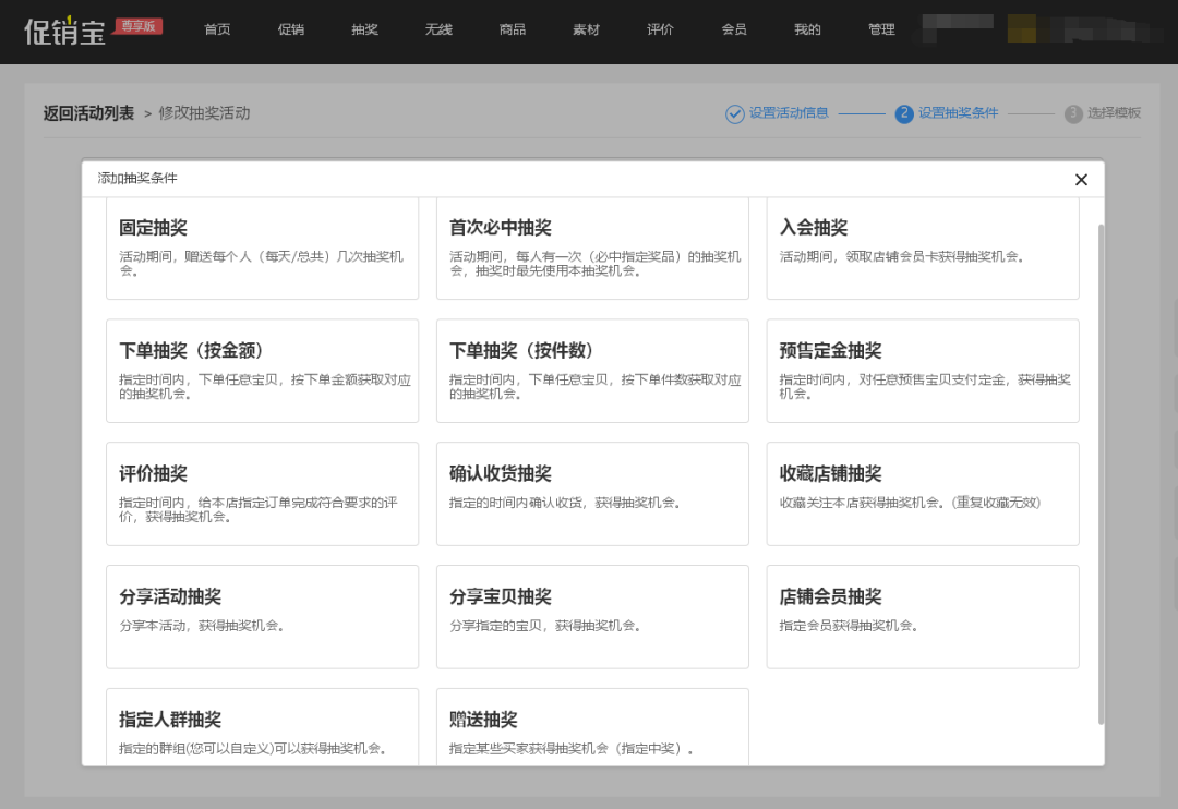 在活动期间,我们可以设置下单抽奖、分享活动抽奖、固定抽奖等来增加店铺曝光、激发用户参与活动的积极性,保证活动期间店铺的访客率。